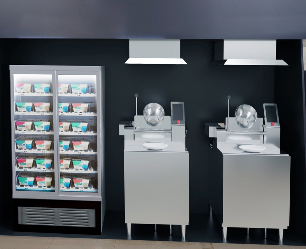 TECHMAGIC開発の炒め調理ロボット「I-Robo2」とミールキットを社食、カフェやオフィスに設置していただき、社員の皆さまご自身が投入したミールキットをロボットが調理することにより、いつでも誰でも出来立ての料理を楽しめるサービス。