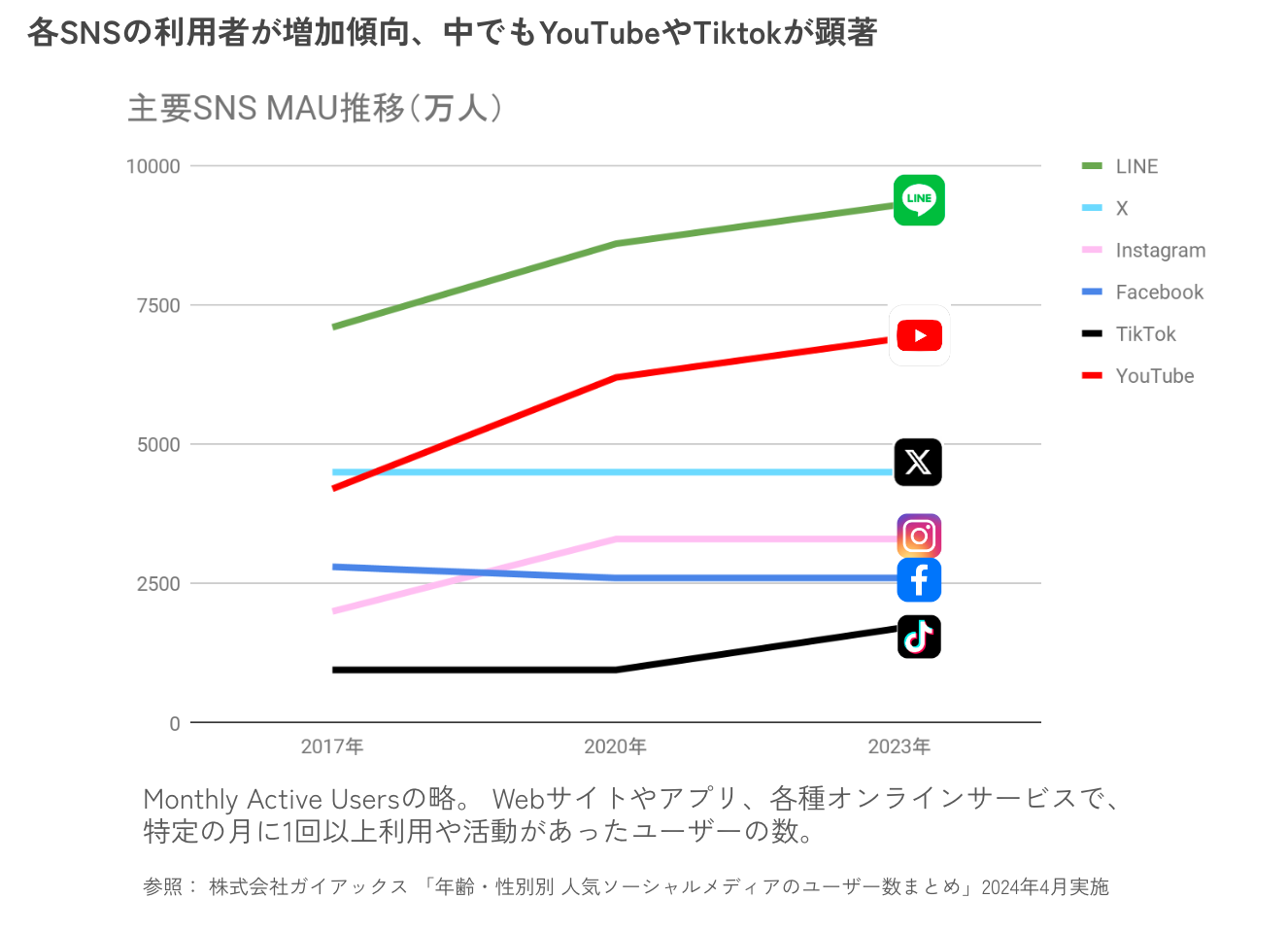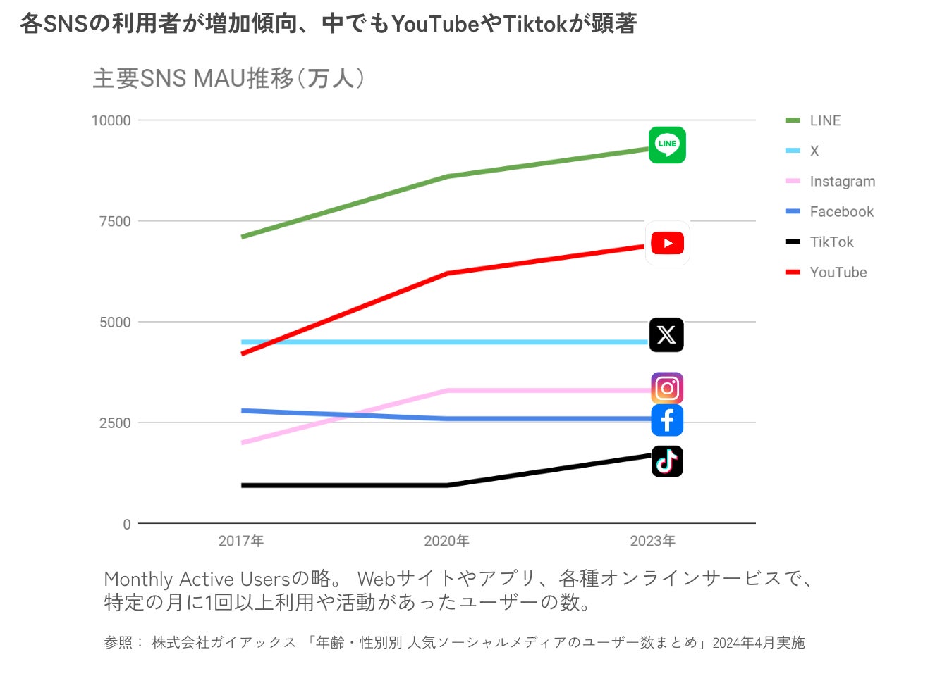 2017年から2023年にかけて、各SNSの利用者が増加傾向であり、なかでも動画コンテンツを主軸としたYoutubeやTikTokは顕著にユーザー数が伸びております。