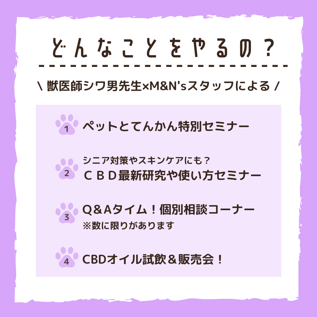また、今年はM&N'sCBDの開発担当も登壇し、「動物とCBDの最新研究」や、2023年に可決された「大麻取締法改正案」について、詳しく解説する時間もご用意しています。
