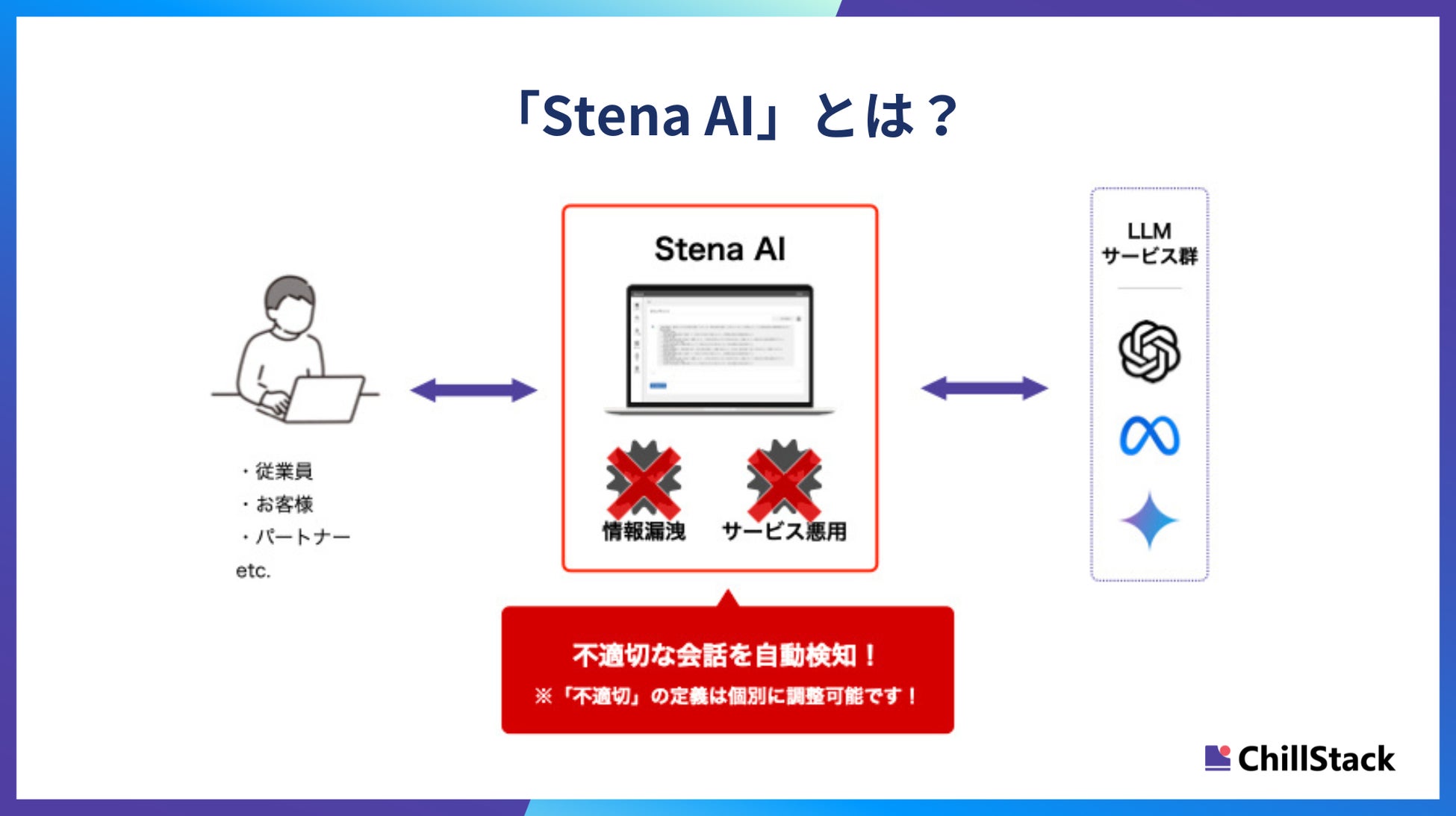 AIを用いた高精度な不正検知サービスやサイバーセキュリティサービスを開発・提供している株式会社ChillStack(本社:東京都渋谷区、代表取締役:伊東 道明、以下「ChillStack」)は、不正利用の自動検知で生成AI活用を促進するサービス「Stena AI」の提供を開始しました。