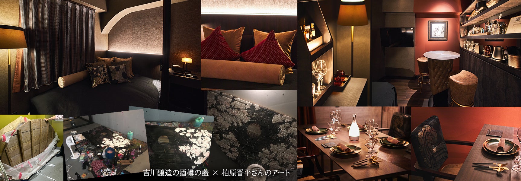 DISH Dining Styleの部屋は3室。それぞれ設えが異なります。お部屋に入るとレストランの個室のようなでお出迎え。ダイニングエリアは深紅色の壁紙がアクセント。メインダイニングのBar & Restaurant COCONOMAのThe barの余韻を継承したデザイン。ベッドルームエリアには宇宙をテーマにしたアートを飾り、絶妙な透け感のカーテンでそれぞれの空間を演出します。美食とお酒を楽しむための和のエッセンスが入ったアーティスティックなDISH Dining Style.