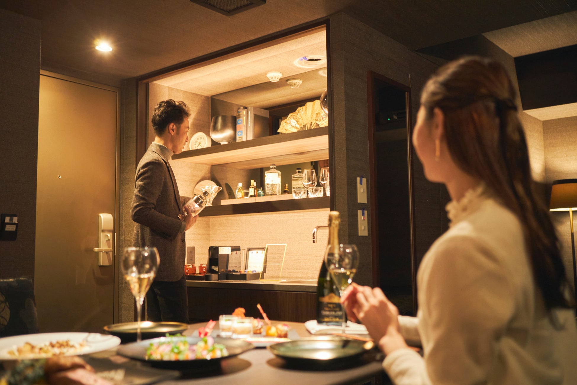 ・お部屋に備えてあるシェイカーやリキュールでバーテンダー気分を体験できます。美食を堪能した後は、明かりを少し絞って再びお酒をお愉しみください。大切なお連れ様に特別な一杯をふるまってみてはいかがでしょうか。ジンやウイスキーを置いており、山崎12年など銘酒を嗜んでいただけます。お飲み物はすべて宿泊料金に含まれています。
