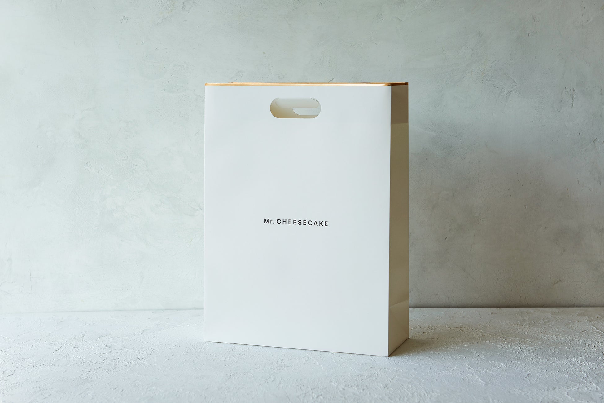商品説明:手渡し用のギフトバッグ。ギフトバッグ1枚、内袋1枚、保冷剤1個がセットになっています。本商品には、Mr. CHEESECAKE with Boxまたは期間限定フレーバー2点、もしくはMr. CHEESECAKE with Cooler Bag1点まで収納可能です。スッキリとしたシルエットで、上部はゴールドの箔でアクセントを加えています。箔はケーキの焼き目を彷彿とさせ、お渡しの瞬間からわくわくしていただけるようなデザインになっています。