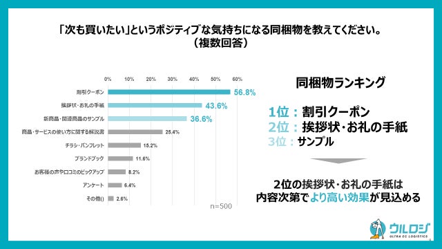 次に、ECヘビーユーザー500名に対して、「「次も買いたい」というポジティブな気持ちになる同梱物を教えてください。」とお伺いしたところ