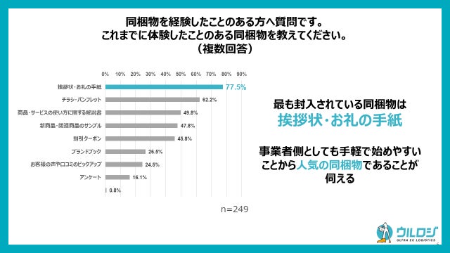 上記の同梱物の経験がある方に対して「これまでに体験したことのある同梱物を教えてください。」とお伺いしたところ、約8割の方が「挨拶状・お礼の手紙」を経験したことがあると回答しました。