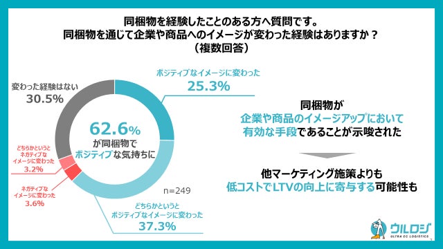 続いて、同じように同梱物の経験がある方に「同梱物を通じて企業や商品へのイメージが変わった経験はありますか?」と聞いたところ、62.6%がポジティブなイメージに変わったと回答しました。一方でネガティブなイメージになったという方は6.8%とかなり少数であることが判明しました。
