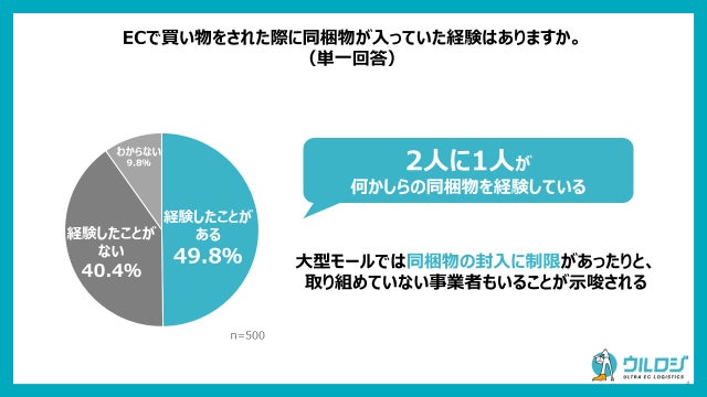 EC・通販で月に1回以上買い物をする方500名を対象に「ECで買い物をされた際に同梱物が入っていた経験はありますか。」とお伺いしたところ49.8%の方が経験したことがあると回答しました。