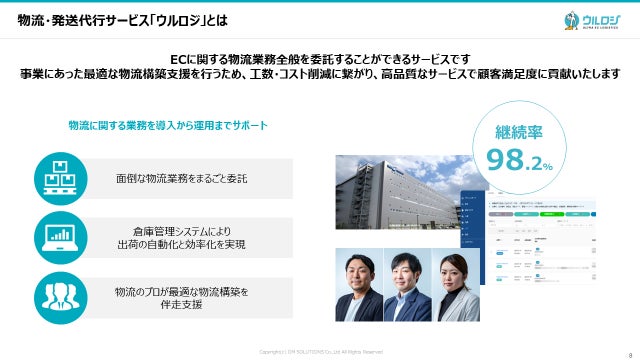 「ウルロジ」は、ディーエムソリューションズ株式会社が提供するECビジネスに特化した物流・発送代行サービスです。