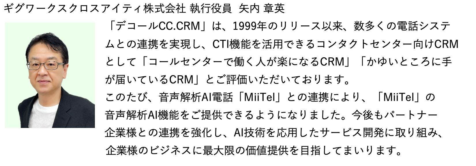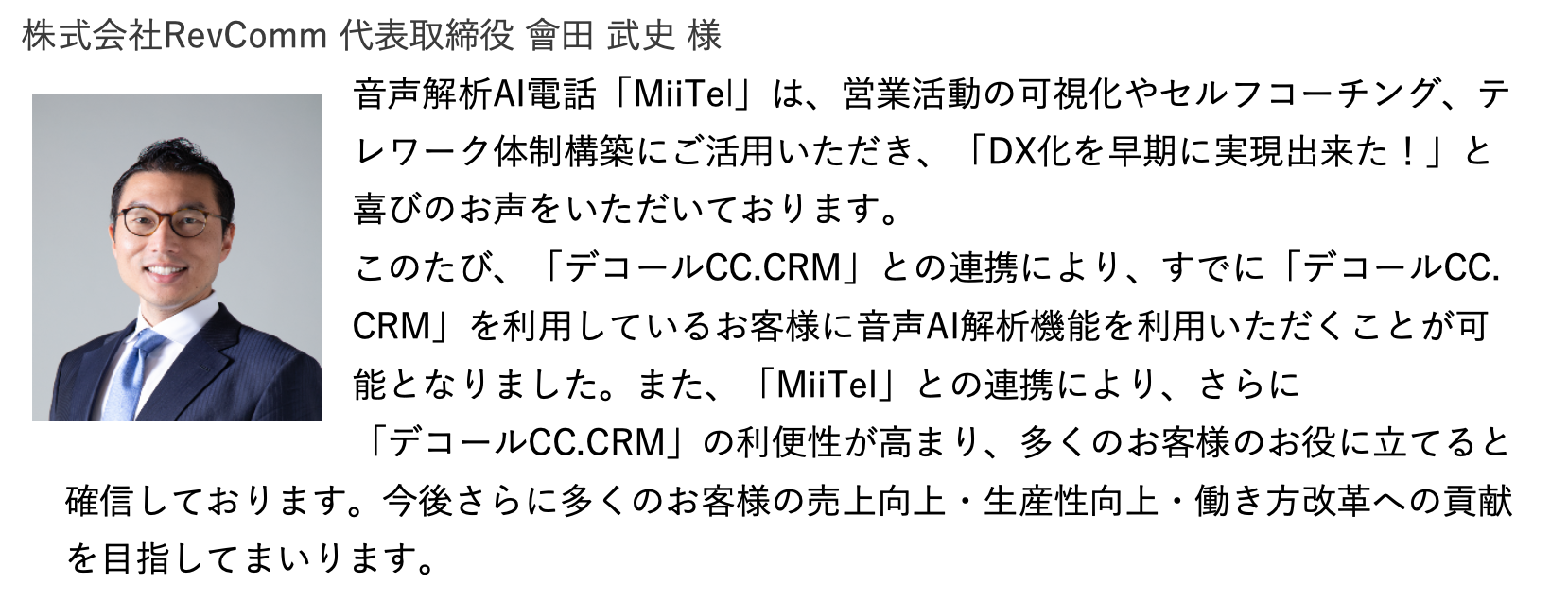 今後、「デコールCC.CRM」「MiiTel」の連携により、「デコールCC.CRM」利用企業は使い慣れたCRM画面を利用しながら、音声解析AIを活用した全文文字起こし、要約、話速やトーク・リッスン比率、抑揚などの通話音声分析、音声感情認識といった情報をCRM情報に自動的に紐づけることができ、一人ひとりのスタッフのセルフコーチングやコールセンター業務全体の品質向上に役立てることが可能となります。