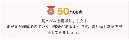 2. 確認テストを終えると、合計点数に応じて獲得したメダルが表示されます。また、間違えた問題の解説も見ることができます。