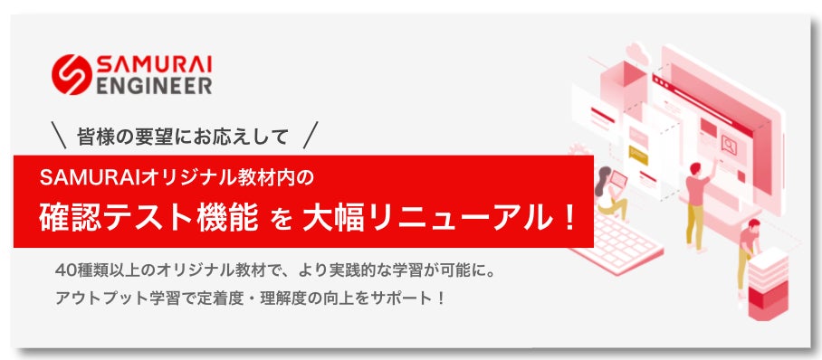 プログラミングスクール「SAMURAI ENGINEER」を運営する株式会社SAMURAI(本社所在地:東京都渋谷区、代表取締役 :佐藤 大央)は、当社が展開するオリジナル教材の「確認テスト機能」を大幅リニューアルいたしました。