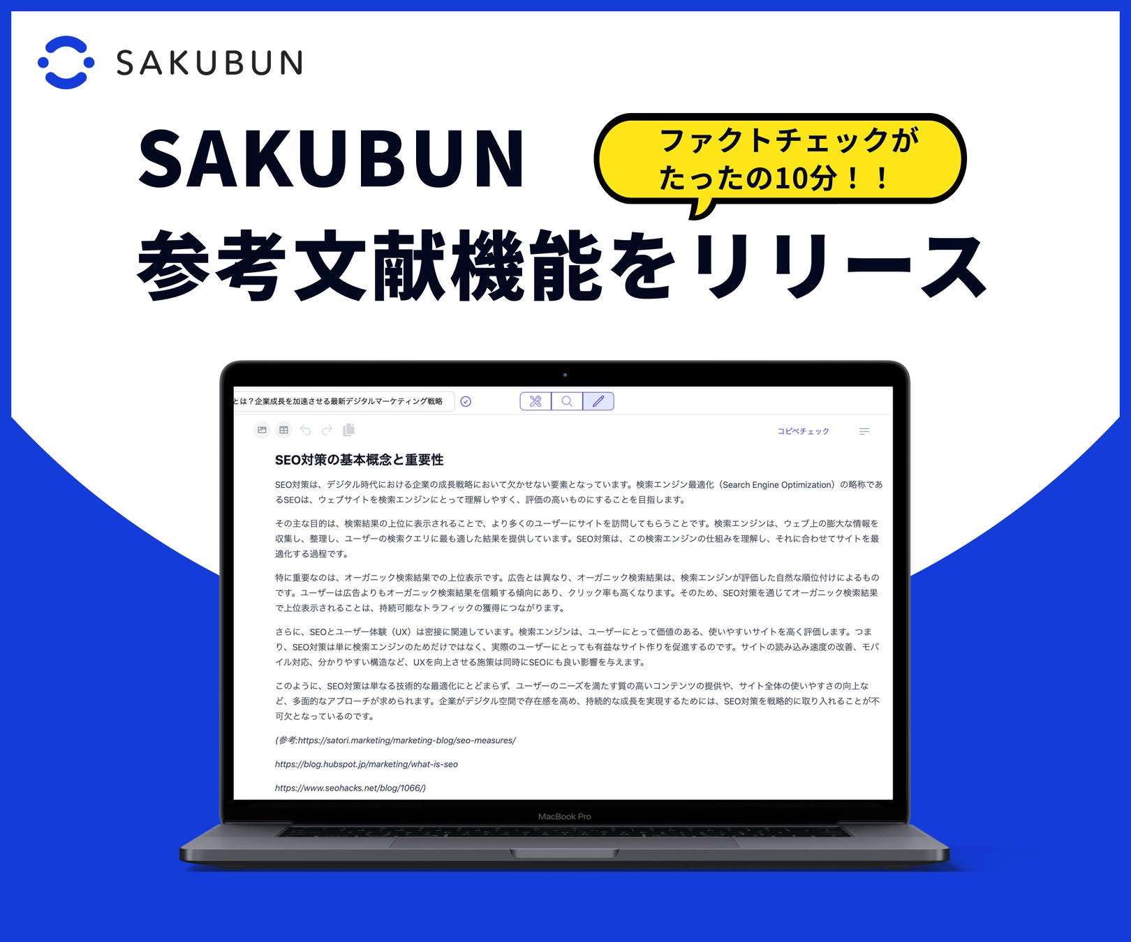 NOVEL株式会社(本社:東京都中央区、代表:岡田徹)は、法人向けAIライティングツール「SAKUBUN」において、新機能「参考文献機能」をリリースいたしました。この機能により、AIを活用したコンテンツ制作におけるファクトチェックの効率化と、コンテンツSEOへのAI導入を安全に行うことが可能になります。