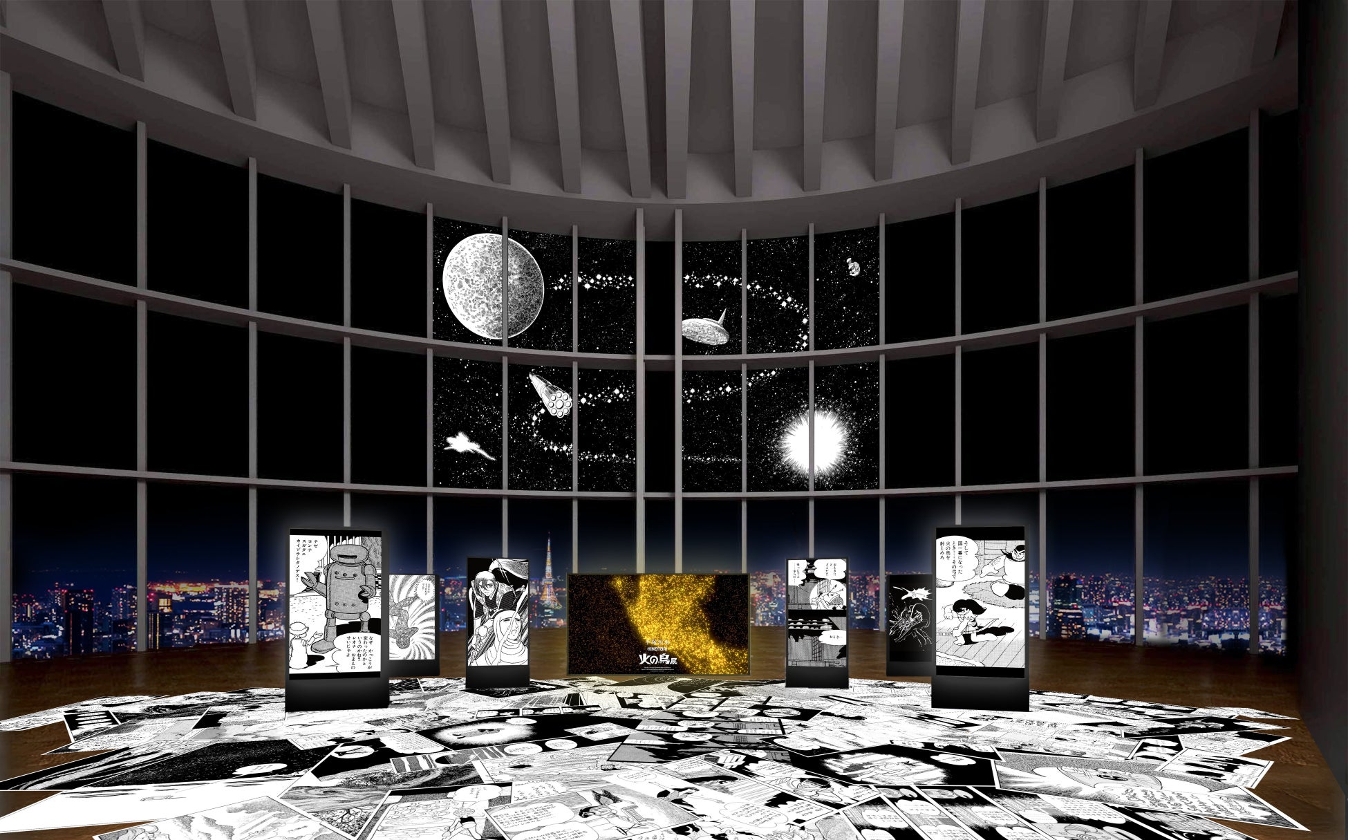 東京シティビューのエントランスには、【プロローグ 火の鳥・輪廻シアター】と題して、『火の鳥』の作品世界を、空間全体にダイナミックに展開します。展望台の窓面、複数の大型モニター、床面すべてを通して、『火の鳥』の魅力や奥深さをお伝えし、マンガと眺望が融合した新感覚の没入体験を実現します。フロアのプロデュースと映像制作は、福岡氏が提唱する「動的平衡」のコンセプトムービーを制作したデザイナー・中村勇吾氏が担当。中央の画面には、粒子の動きで表現した「動的平衡」のイメージに重ねて、火の鳥が飛翔しているオリジナル映像を映します。左右に配置された6基のモニターには、「黎明編」から「太陽編」までの主要12編の中から、中村氏が厳選した名シーンをランダムに表示し、大迫力の空間を作り上げます。
