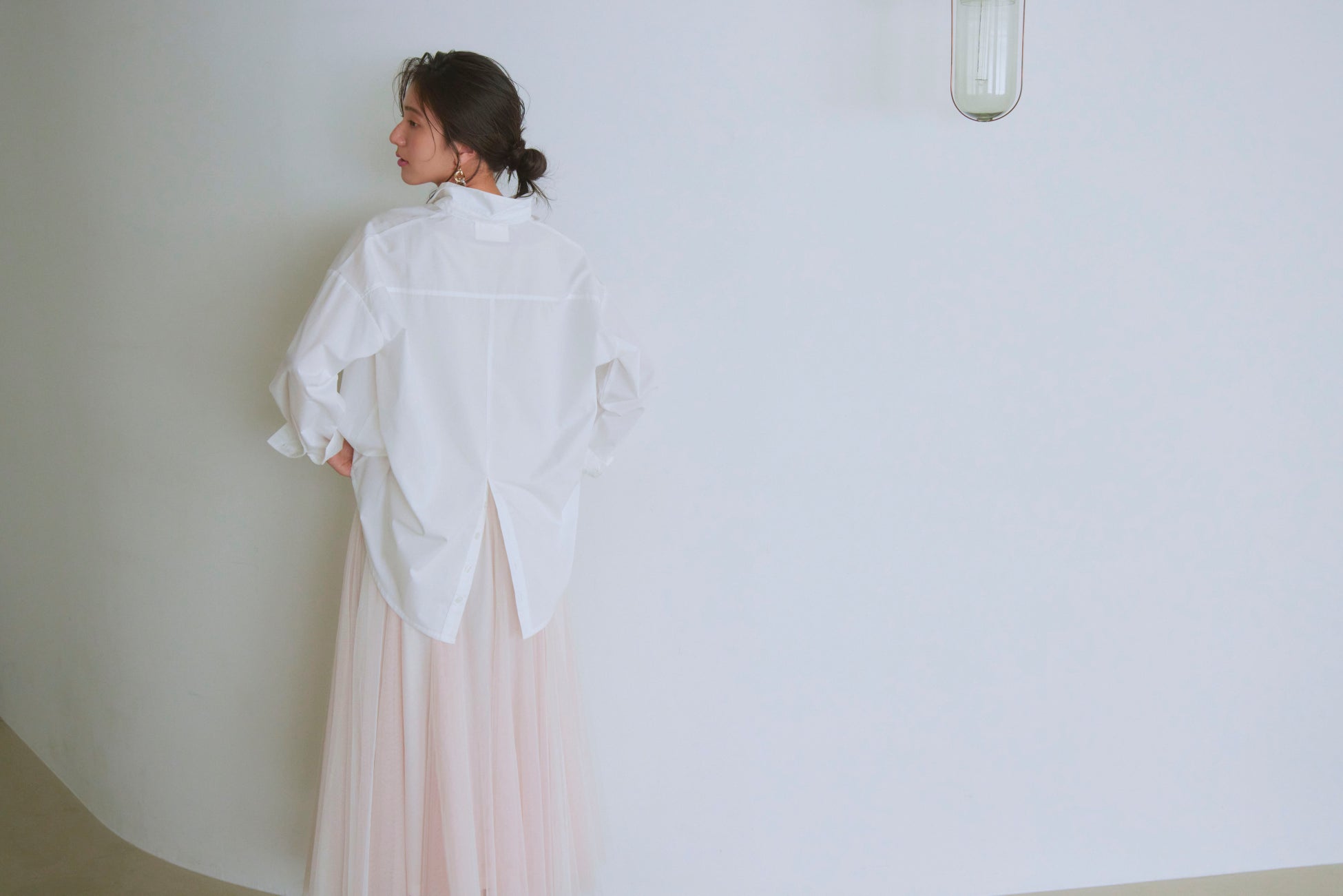 特にチュールスカートなど甘めなボトムスには、端正な白シャツとの相性がピッタリ。