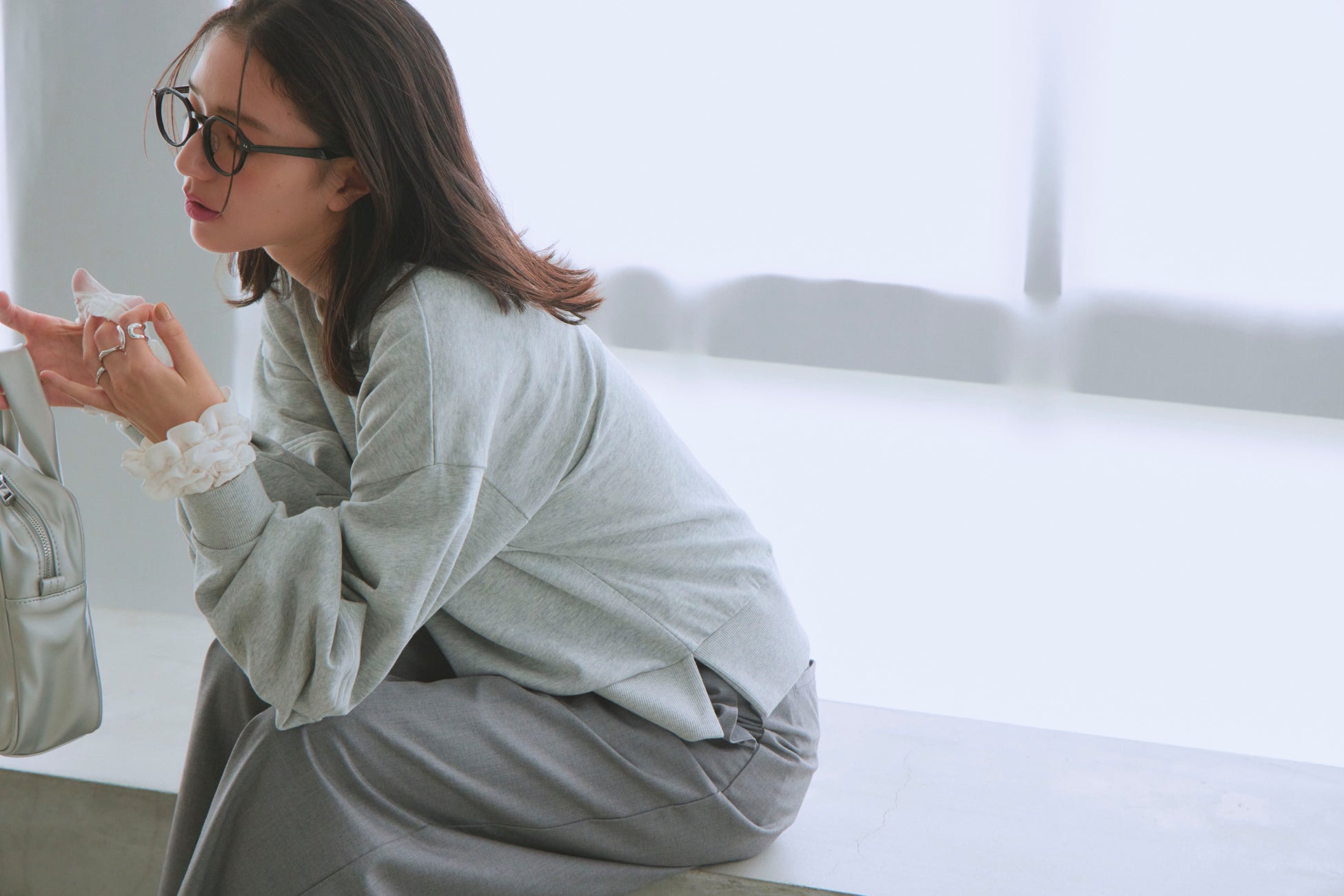丸みのあるシルエットがハズしすぎず、気楽なスウェットも大人っぽくスマートに。