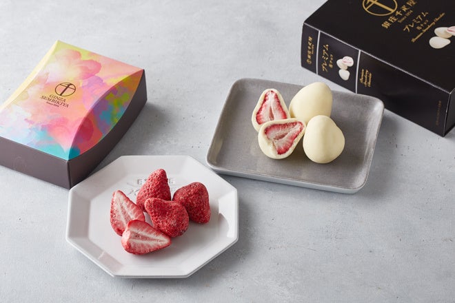国産いちごのフリーズドライにホワイトチョコを染み込ませた「いちごのチョコレート」(左)と、ホワイトチョコの中に国産大粒いちご(2Lサイズ)のフリーズドライを閉じ込めた「プレミアム苺チョコ」(右)が登場。 いちごとホワイトチョコの相性を楽しんで。
