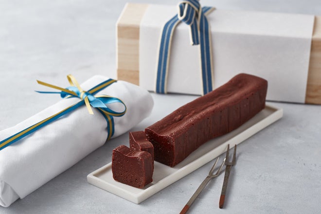 絶妙な焼き加減で生チョコのようにしっとりとした食感に焼き上げたショコラ。カカオハンターズの小方真弓氏が厳選したトゥマコ(コロンビア)産カカオ82%の香りが、なめらかな口どけとともに広がります。包装は、真田紐をかけた桐箱または手拭いの2種類。
