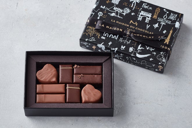 限定レシピ3種と定番1種を2粒ずつ詰め合わせた「フォルマン パリ」の箱は、黒地に白とゴールドでフランスのシンボルをイラストレートし、 ブラックのリボンをかけたシックなデザイン。期間中は「ハート ギフトボックス S1」(¥6,264)もご用意します。