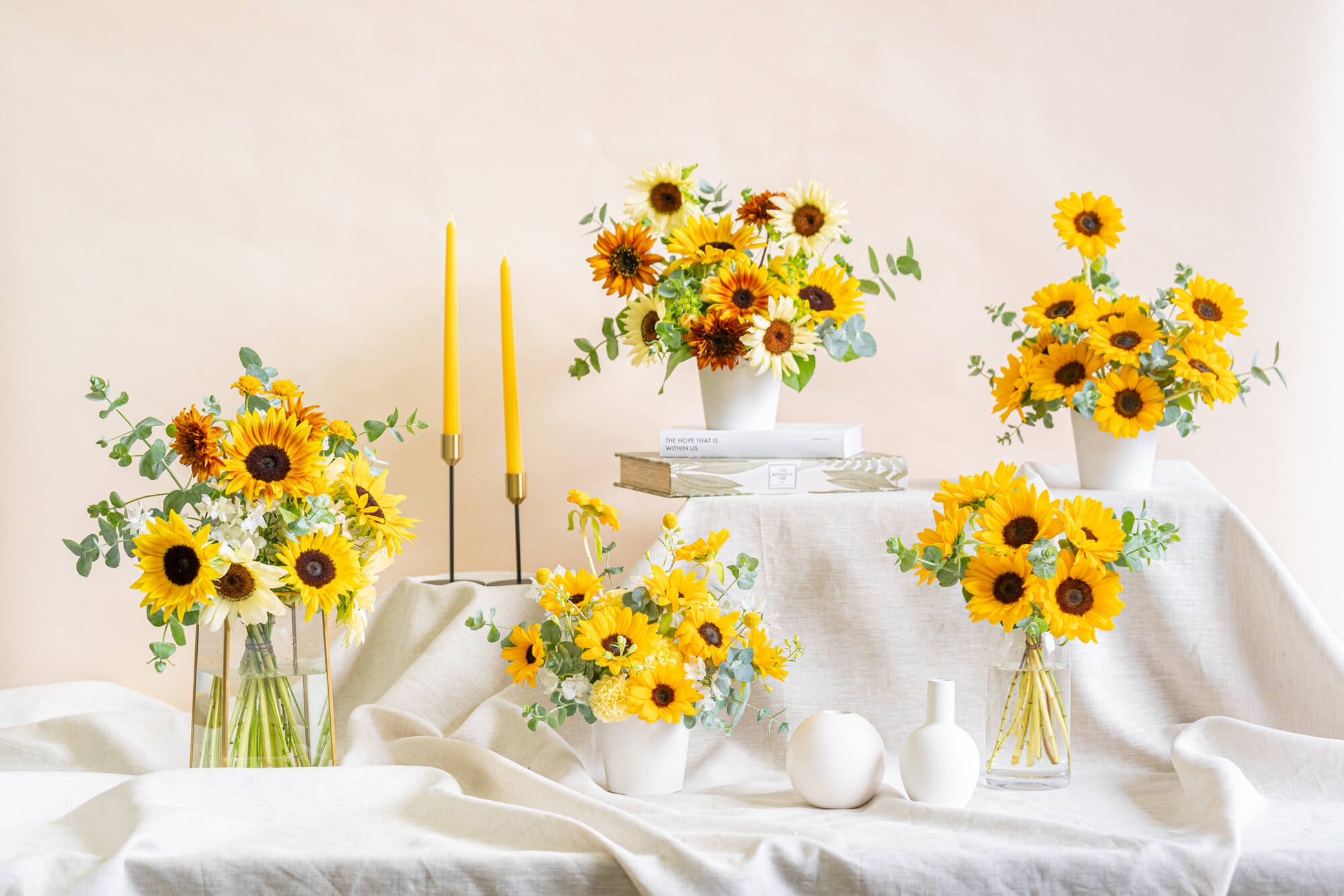 アートのような存在感が魅力的な「ひまわりシリーズ」は、ご自宅の雰囲気を変えたい時やホームパーティの演出、ギフトにもぴったりです。また、今回のシリーズは一部の商品を除き、通年で仕入れられる花材を用いており、残暑以降もお楽しみいただけるデザインが特徴です。季節が移り変わってもなお、クラシック&ノスタルジックな世界観を存分にご堪能いただけます。