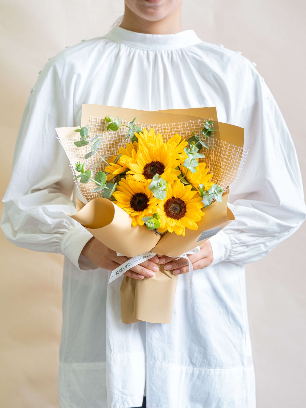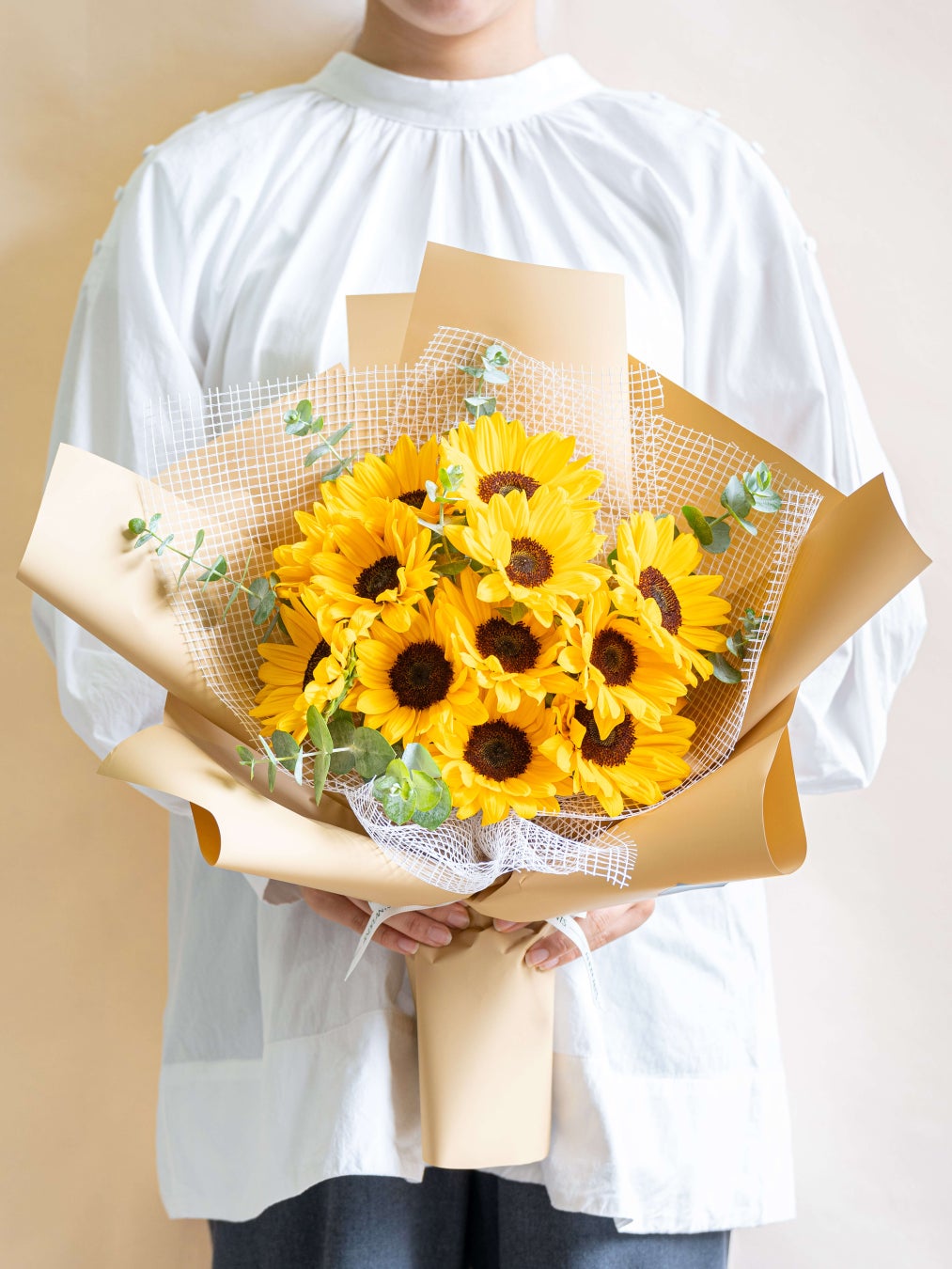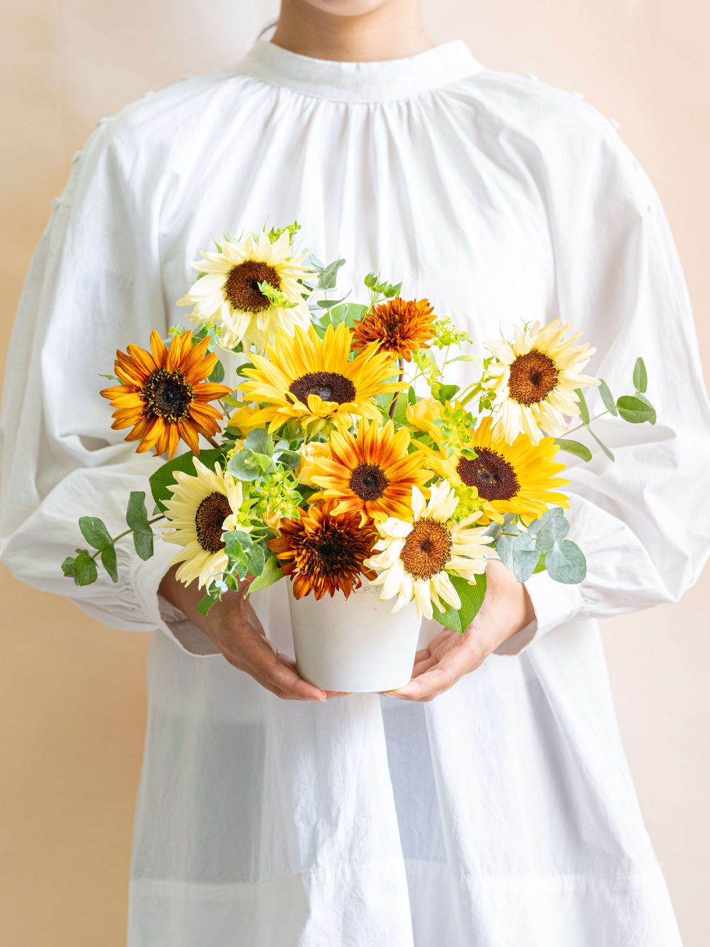 今回のシリーズでは、このベーシックなオレンジ色のひまわりを用いた商品のほか、夏季限定商品には一風変わった品種のひまわりも集め、ブーケやアレンジメントを合計9種類ラインナップ。ひまわりの色に合わせた、カフェオレ色のラッピングもご用意しています。