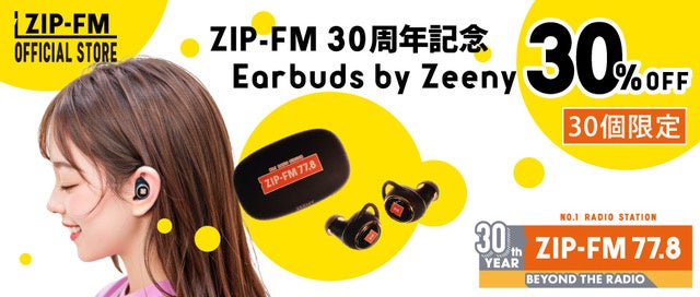 そこで、ZIP-FMの開局30周年を記念して、「ZIP-FM Earbuds by Zeeny」の30% OFF企画が決定しました。