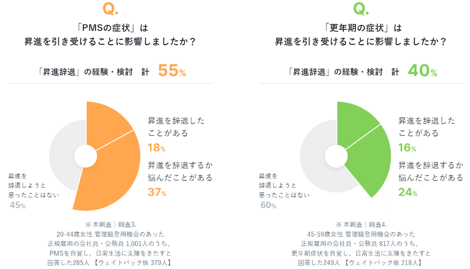 各症状は仕事のパフォーマンスに影響し、昇進辞退や退職に至るケースもあります。PMSで5割以上、更年期症状で4割以上の女性が職場での昇進をためらったり、辞退していることが分かりました。その傾向は管理職登用の機会があった人たちではさらに高まり、女性の健康課題がキャリア形成に深刻な影響を及ぼすことが分かりました。