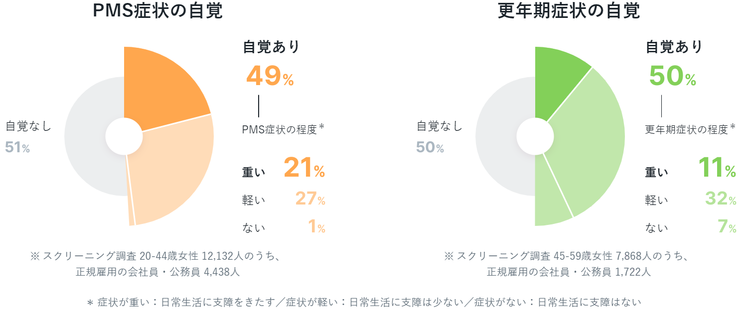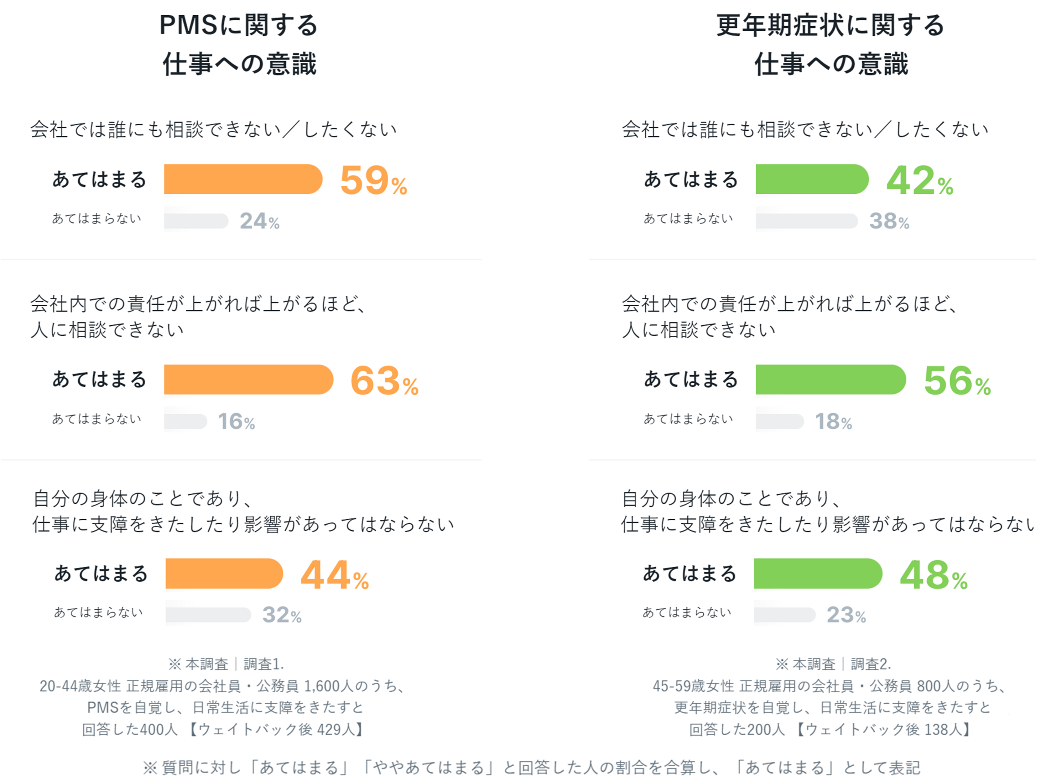 PMS、あるいは更年期症状の自覚がある人は約5割います。その多くが不調を「人に相談したくない」「職場に迷惑はかけられない」と、1人で悩んでいることがわかりました。