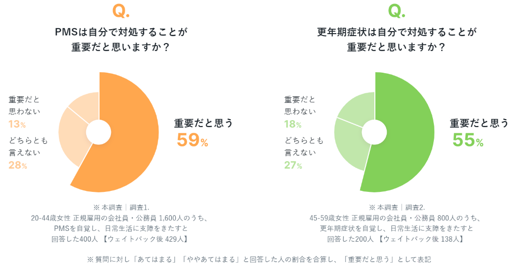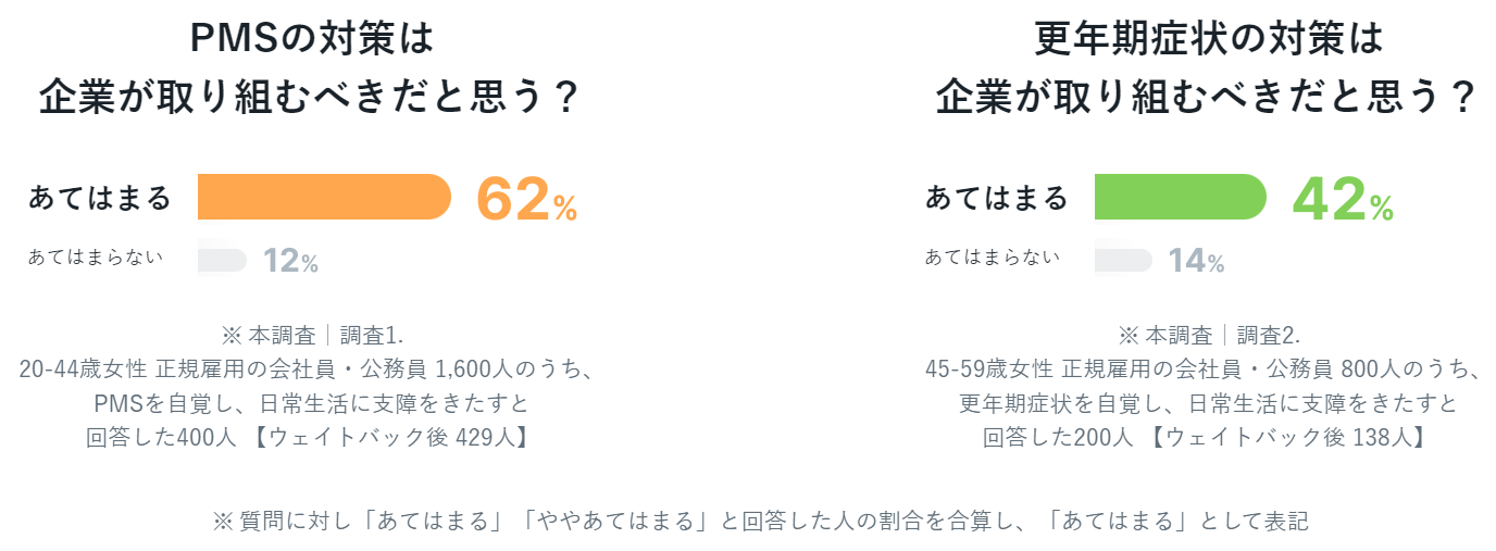 PMS・更年期症状に対し、多くの女性が自身で対処すべきと考えている一方、女性が活躍できる社会の実現に向け、その対策を企業としても取り組むべき課題と捉えてほしいと考えていることが分かりました。つまり企業においては働く女性たちの健康課題に対して「企業ゴト」と捉えることが求められています。