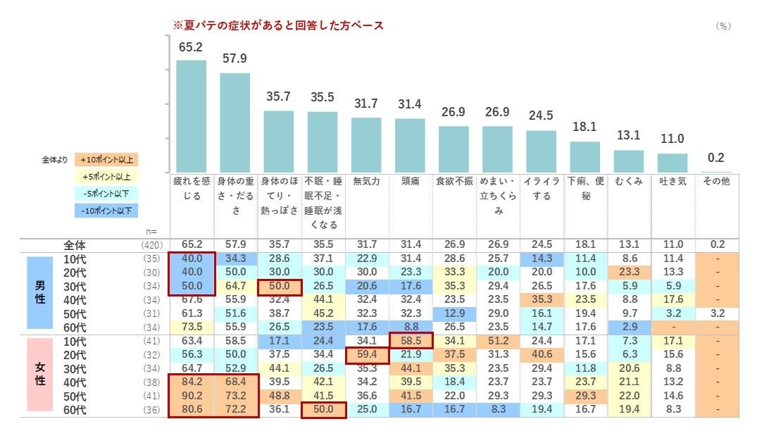 主な症状は、「疲れを感じる」65.2%、「身体の重さ・だるさ」57.9%。特に女性40代以上の7-9割がこれらの症状に該当し、全体よりも10.5~25.0pts高い。各性年代で感じやすい症状は異なるが、女性の方が夏バテを感じていた分(Q1参照)、女性の方が該当する症状が多く幅広い傾向。