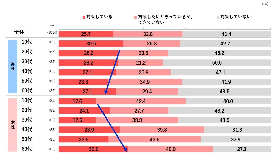 「対策をしている」は25.7%に留まり、「対策していない」が41.4%、「対策したいと思っているが、できていない」32.8%と「対策できていない」が約7割。男性は年代が低いほど「対策している」が減り、逆に女性は年代が上がるほど増える傾向。