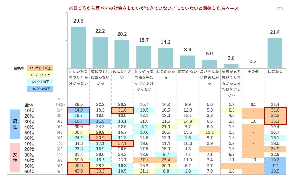 「正しい対策のやり方が分からない」は女性50・60代で4割と、全体より10.4~14.3pts多い一方で、男性10-30代の若年層では1-2割と全体より9.9~15.6pts少なくなっています。「めんどくさい」は男女とも10代が3-4割、「現状でも特に困らないから」は男女とも60代が3割と最も多くなっています。