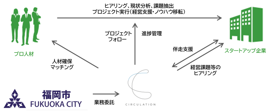 また、今回の支援は、単にプロ人材をマッチングするだけでなく、プロジェクトの成功のために、徹底したフォローアップを行うとともに、プロ人材のマッチング費用や、プロ人材に係る人件費の一部を福岡市が負担いたします。