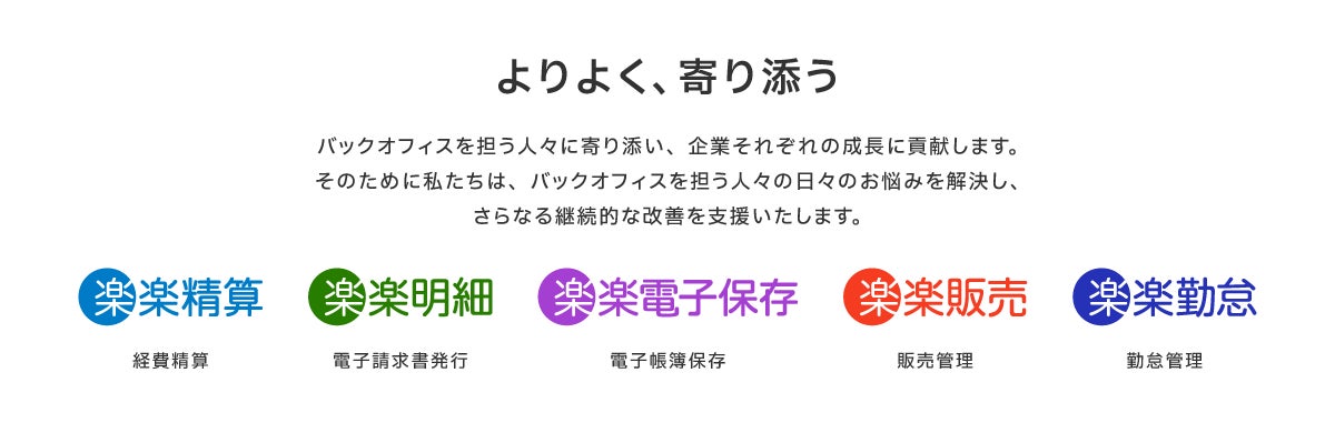 そのような状況下において、ITサービスを通じた企業の支援をさらに加速させるべく、ラクスが展開するバックオフィス向けクラウドサービス「楽楽精算」「楽楽明細」「楽楽電子保存」「楽楽販売」「楽楽勤怠」の5サービスを1つのブランドとして統一し、ブランドメッセージやコミュニケーションを刷新しました。今後は、1サービス単体としてではなく、統一ブランドとしてバックオフィスで働く人々に“よりよく、寄り添う”ことを目指していきます。