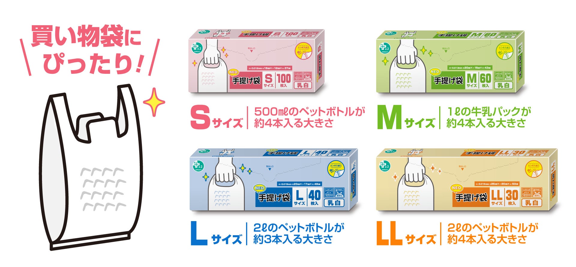 S・M・L・LLの4サイズのバリエーションを揃え、サイズ別に箱の色を変えているので、使用する時に色でサイズの区別ができます。
