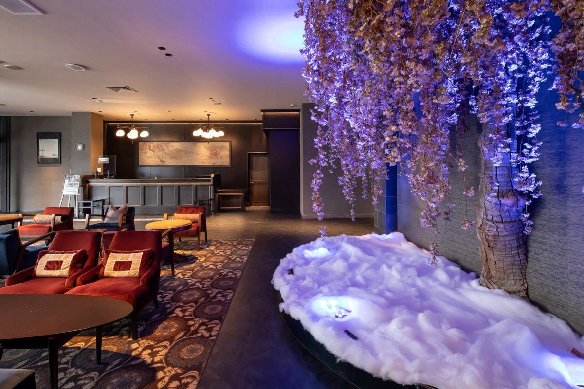 七色に輝く「月下の櫻」。今年の冬はこの時期ならではの風情ある姿をご覧いただけます。足元に雪を思わせる装飾を施し、雪上に咲く櫻をイメージしました。白銀の世界に浮かび上がる「月下の櫻」。温かいロビーに身をおきながら冬ならではの雪上櫻をお楽しみください。