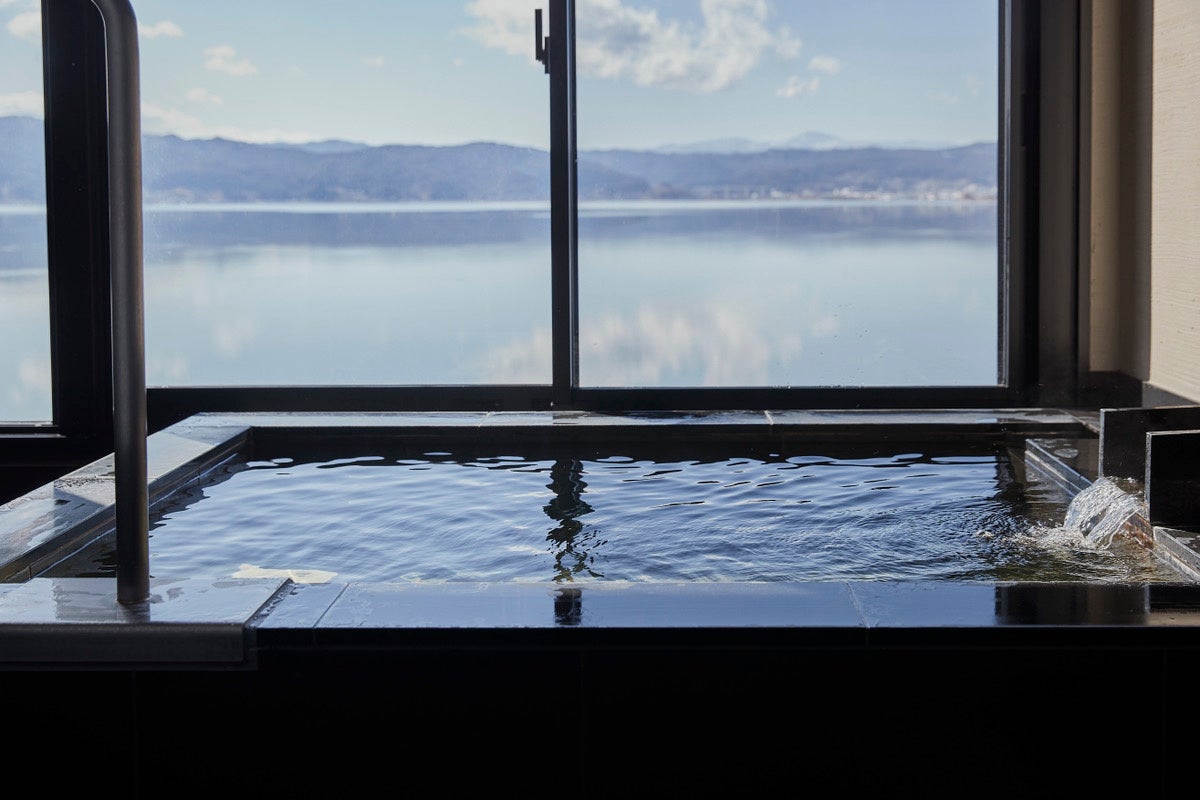 諏訪湖畔に佇む癒しの宿。2022年リニューアルオープン時に、諏訪湖の絶景を臨む露天風呂付き客室や車椅子のまま入れる貸切温泉などにユニバーサルデザインを導入。個室料亭でいただく地産地消の創作和会席や自家源泉の温泉を堪能し、七色に輝く「月下の櫻」や水墨画など美術館のような館内で癒しの時間を過ごせる。宿泊者限定の諏訪大社四社を巡る無料参拝バスも人気を博している。