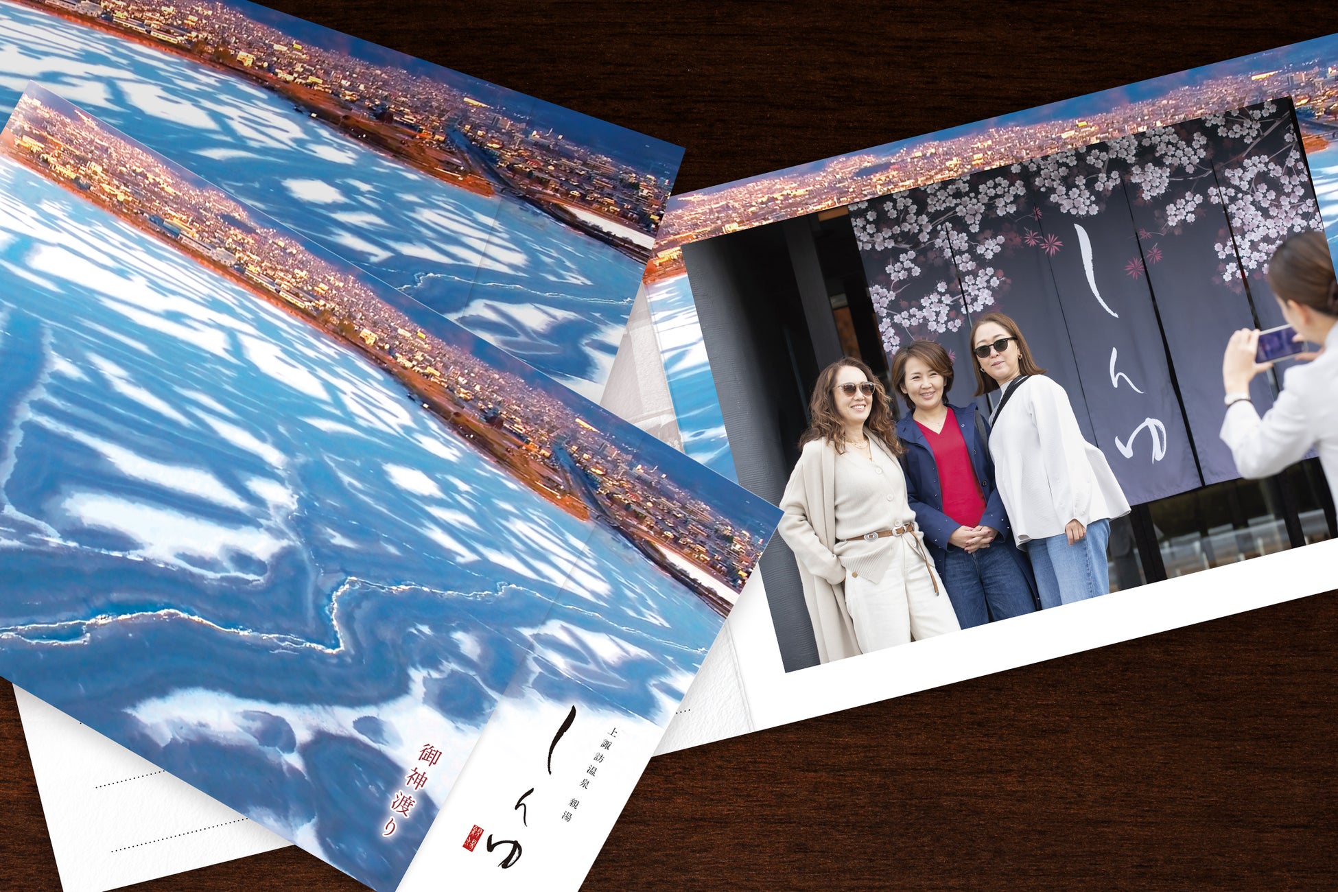 1日5組限定で販売している「御神渡り祈願プラン」は、御神渡りのことを知っていただき、お客様にも御神渡り出現祈願にご協力いただけたらという思いで始めました。本プランでは、御神渡り祈願のお礼として、心ばかりのプレゼントをご用意しております。本プランをご利用のお客様全組に当館限定の御神渡りフォトフレームカードと記念写真をプレゼント。さらに、氷点下5℃以下の場合は、館内利用券もサービスいたします。