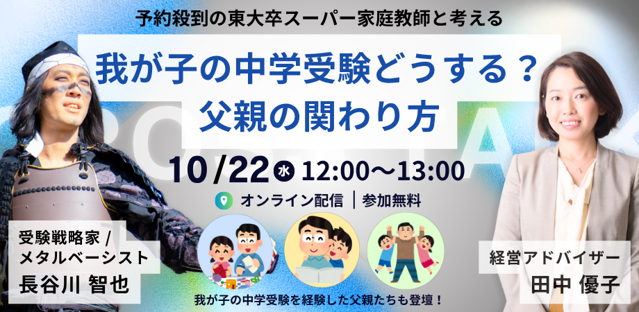 近年、加熱している中学受験。一方で、父親の関わり方は意外と知られていません。中学受験の事情に詳しい専門家と共に、我が子の受験を経験した父親たちが、子どもへの関わり方や夫婦での役割分担など体験談を共有し、成功・失敗事例から学ぶリアルな対話を展開します。