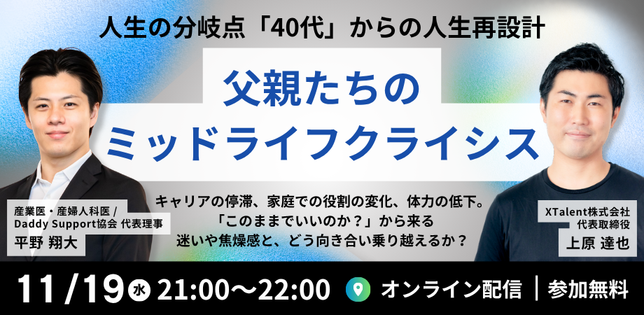 XTalent株式会社(読み:クロスタレント、本社:東京都港区、代表取締役社長:上原達也)は、2025年の国際男性デーにあわせて、父親の「キャリア」「子育て」「教育」「心身の健康」をテーマにした、全4回にわたるオンラインイベントを開催いたします。
