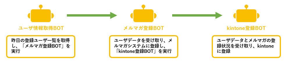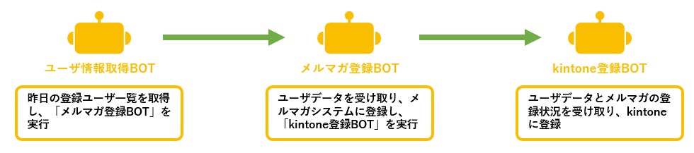 以下の例では、サービスサイトからユーザの一覧データを取得するBOTと、それをメルマガシステムに登録するBOT、kintoneに登録するBOTをそれぞれ作成し、『BOT実行』アプリを使用して順次実行しています。