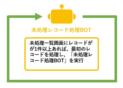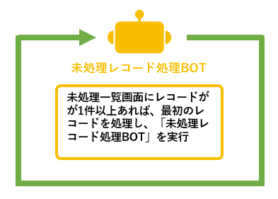一覧画面などで、“未処理レコードが存在する場合にレコードを処理し、『BOT実行』アプリで自身を実行するBOT”を作成する事で、未処理レコードが無くなるまで処理を繰り返し実行するフローを構築する事もできます。