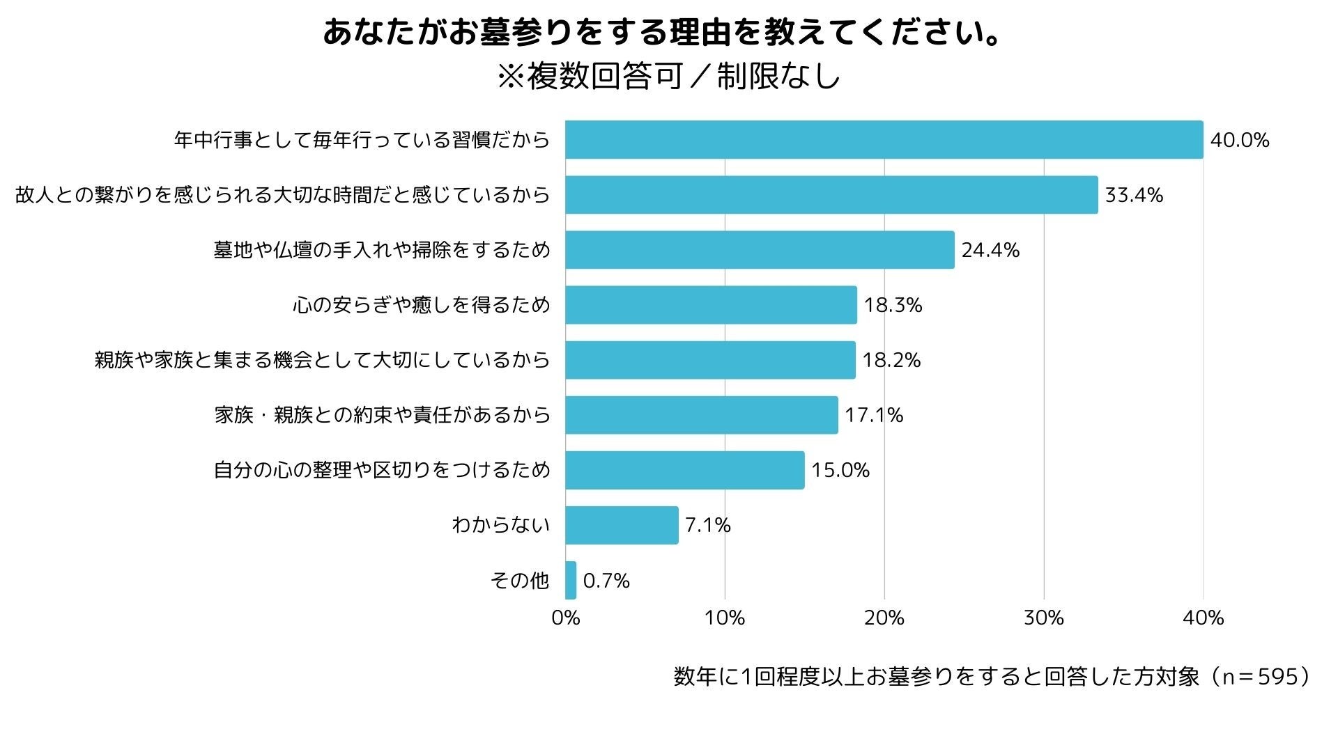 「数年に1回程度以上お墓参りをする」という方にうかがった、その主な理由としては「年中行事として毎年行っている習慣だから」(40.0%)、「故人との繋がりを感じられる大切な時間だと感じているから」(33.4%)が上位に。