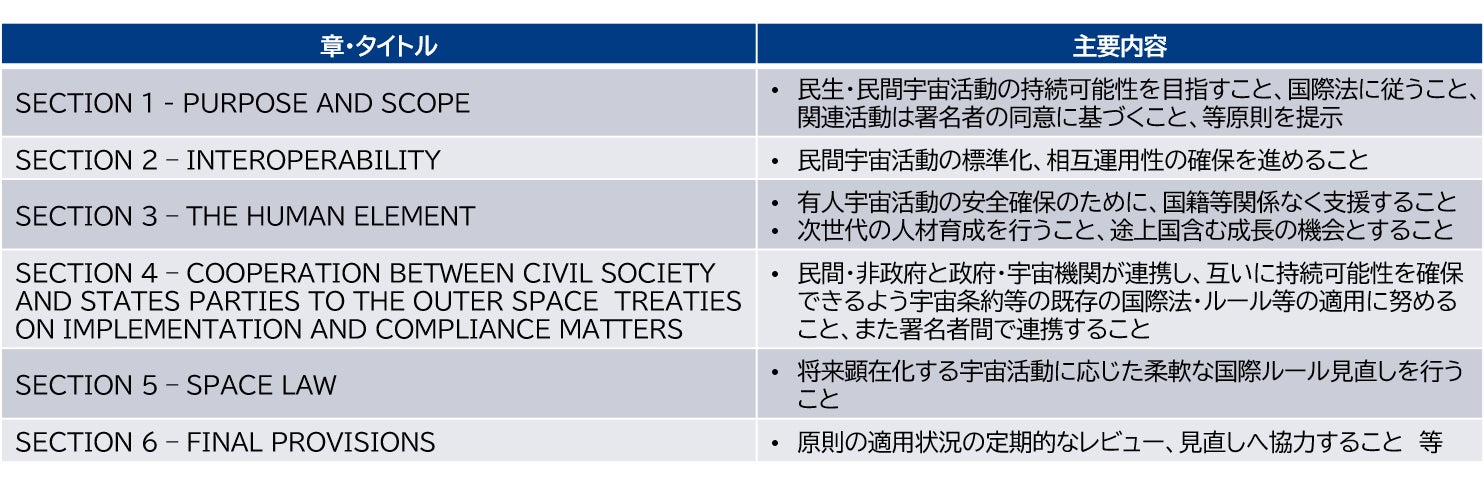 表:「商業宇宙活動の行動規範に関する原則」(ワシントン・コンパクト)の構成