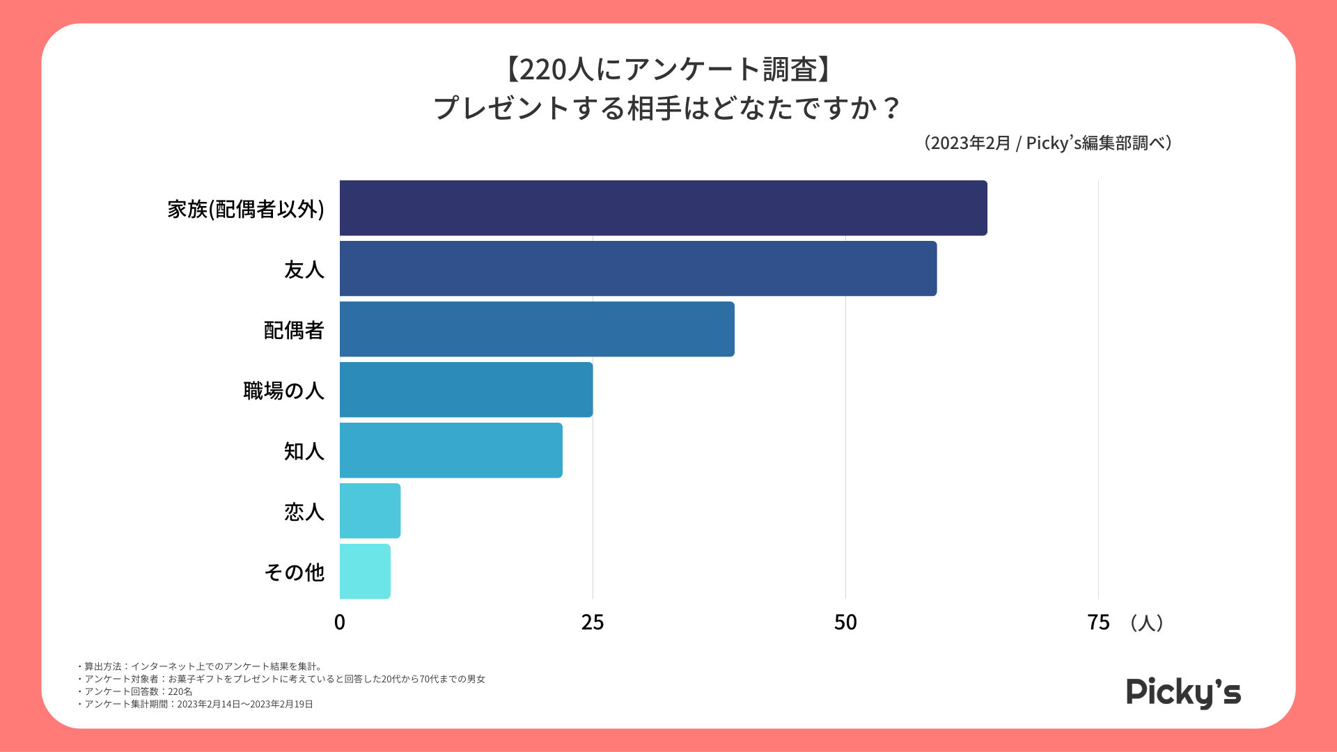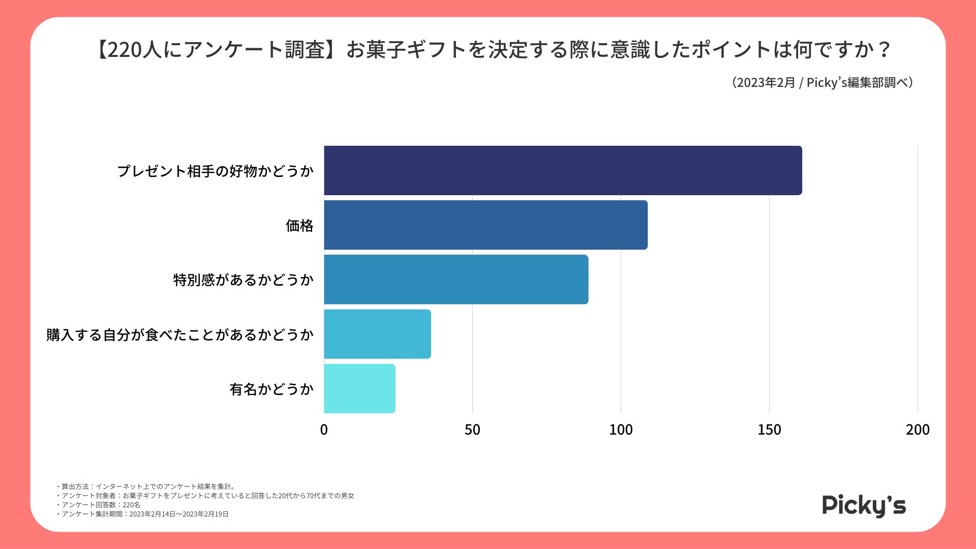 「Picky’s」は、インターネットショッピングにおいて、購入前に試せない・選ぶべきものがわからないという課題の解決を目標に、あらゆる商品のおすすめランキングや検証レビューを紹介するサイトです。このたびPicky’s(https://rentry.jp/note/)では、2023年3月12日スイーツの日に先駆けて、お菓子ギフトについてインターネット上でアンケート調査を行いましたので発表いたします。
