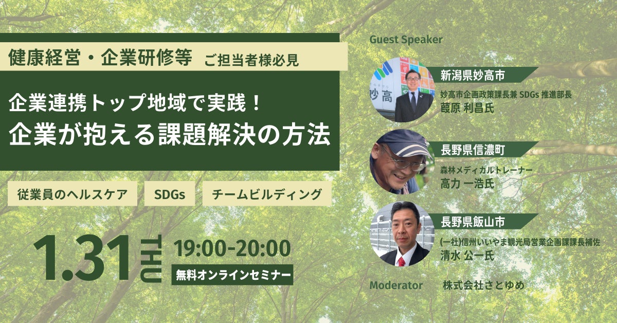 健康経営・企業研修等ご担当者の方必見!3地域(信濃町・飯山市・妙高市)と考えるオンラインセミナー 従業員のヘルスケア ×SDGs × チームビルディング