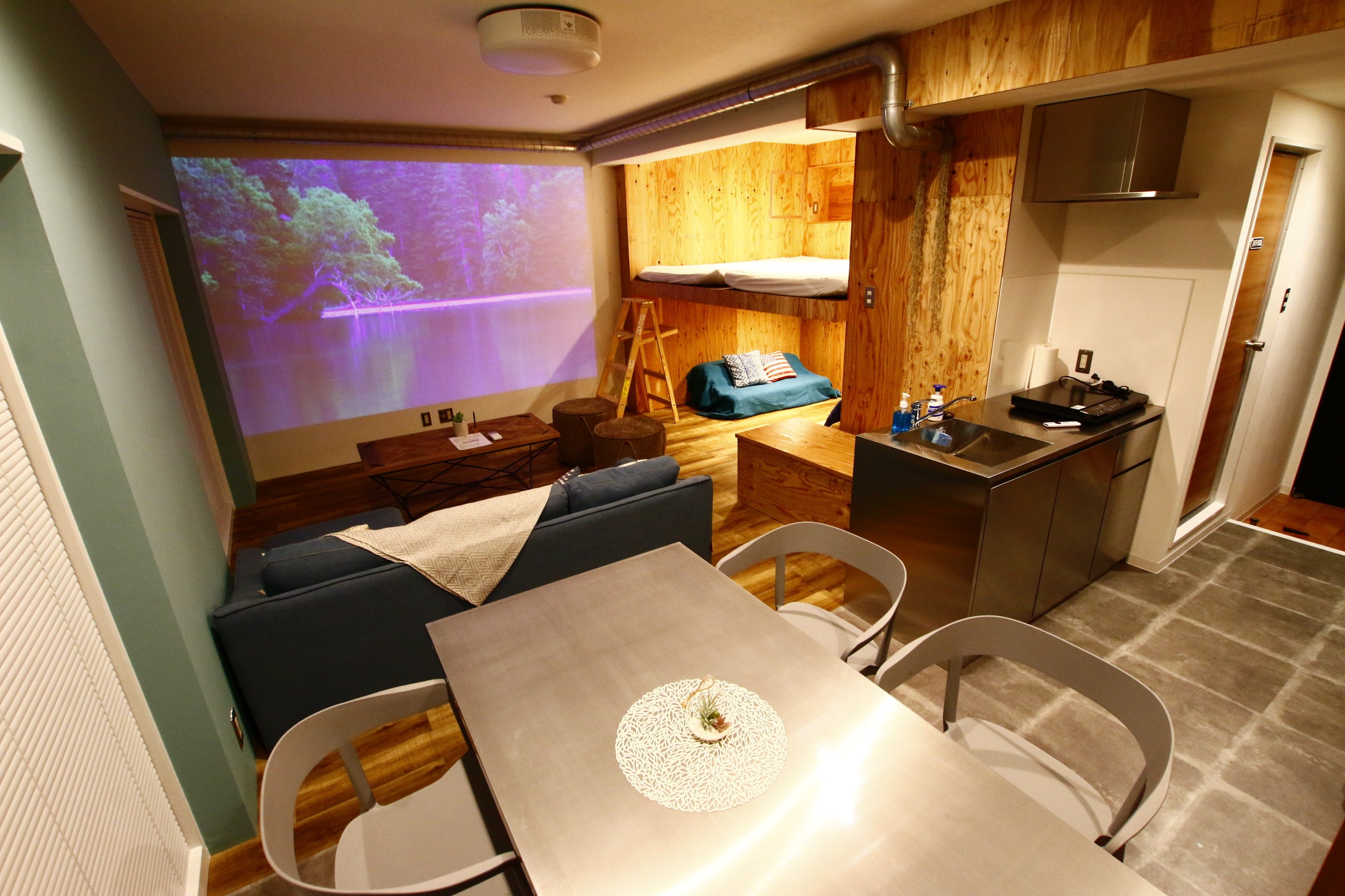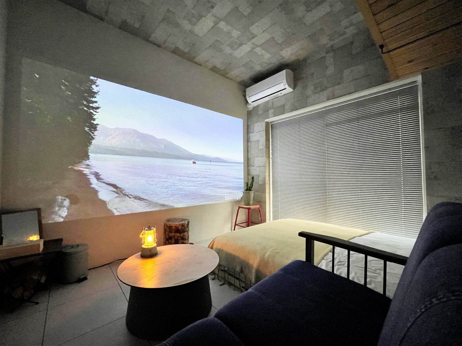 お部屋には二人掛けのソファとpopIn Aladdin(プロジェクター)があるのでゆっくりとくつろげます。