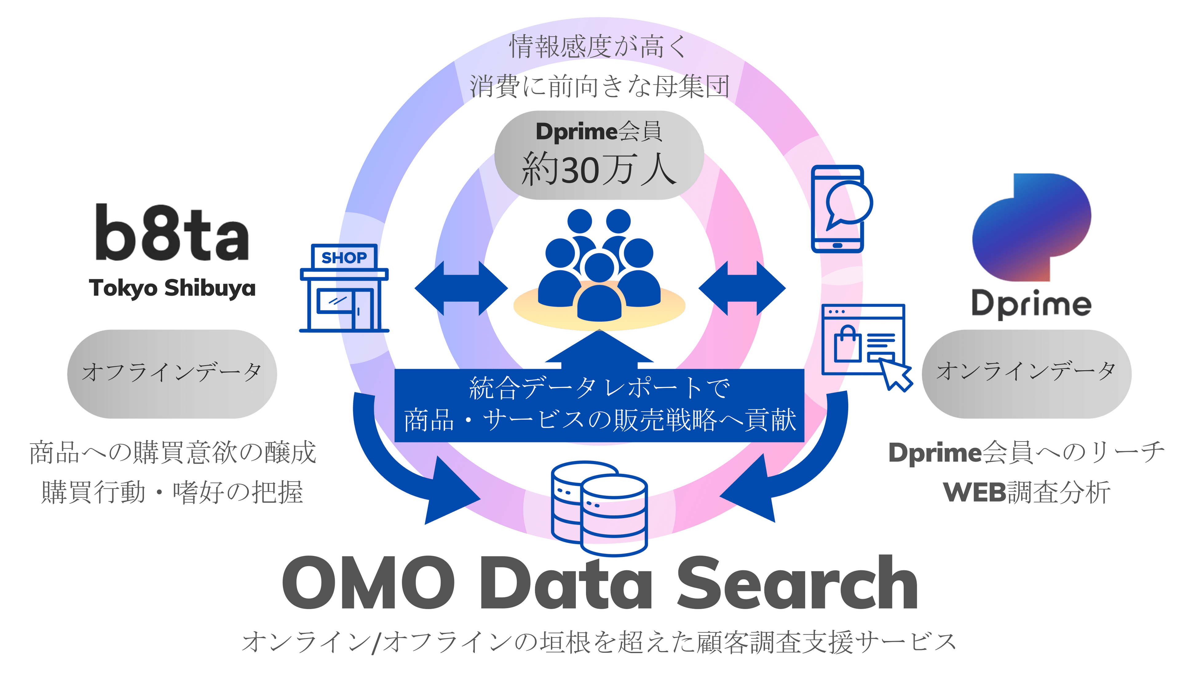 b8ta Japan(本社:東京都千代田区、代表:北川卓司、以下b8ta)は、三菱UFJ信託銀行株式会社(本社:東京都千代田区、取締役社長:長島 巌、以下三菱UFJ信託銀行)と2023年11月1日(水)、b8taではリアル店舗に訪れるお客様を対象としたオフラインのデータ取得を、三菱UFJ信託銀行の「Dprime」アプリではオンラインの約30万人におよぶDprime会員を対象としたオンラインのデータを同期間に収集することを目的とし、オンライン/オフラインの垣根を超えた顧客調査支援サービス「OMO Data Search」のサービスをリリースし、協業を開始いたします。