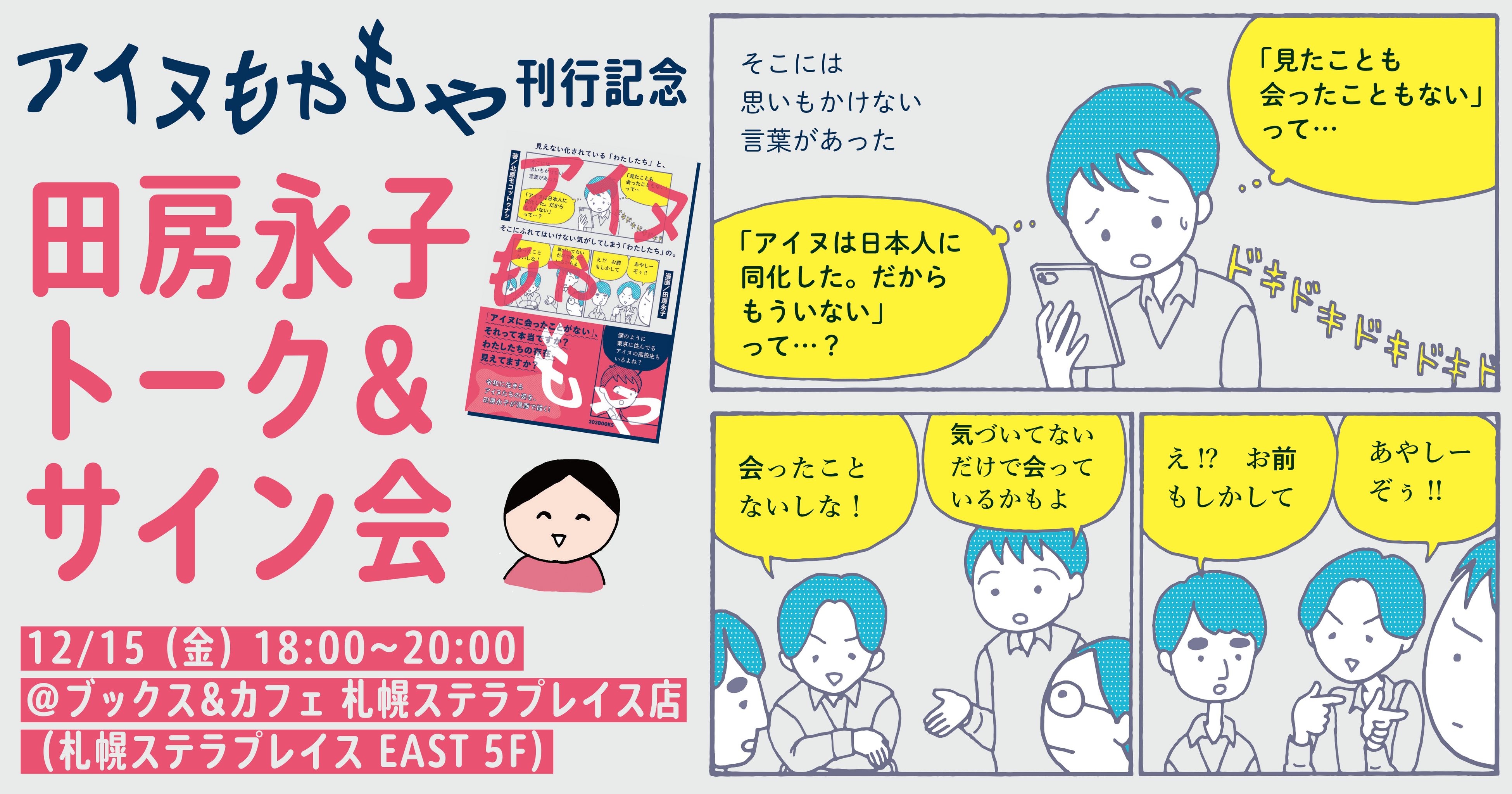 ※イベントまでに『アイヌもやもや』をご購入済みの方は、当日は『アイヌもやもや』と店頭で配布されたイベント参加券をご持参ください。フォームでお申し込みの方は、当日、開演前に書籍をお求めいただき、イベントにご参加ください。