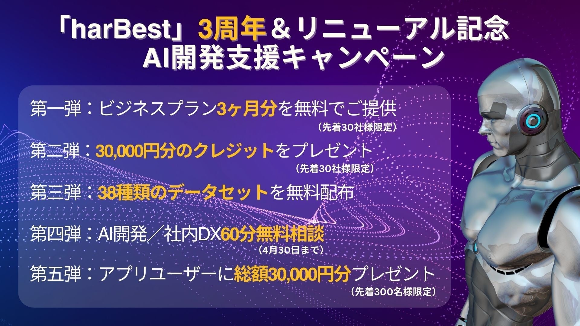 「harBest」は、開発過程で生じる「データ」「モデル」「人的リソース」などあらゆる課題に対応すべく誕生した、AI開発支援プラットフォームです。この度、業種・業界を問わず数多くの皆様に支えられて、「harBest」はサービス提供開始から3周年を迎えることができました。そこで、日頃からの皆様への感謝を込めて、またより多くの皆様にもっと「harBest」の存在を知ってほしいという思いから、3周年&リニューアルを記念した特別なキャンペーンを実施いたします。
