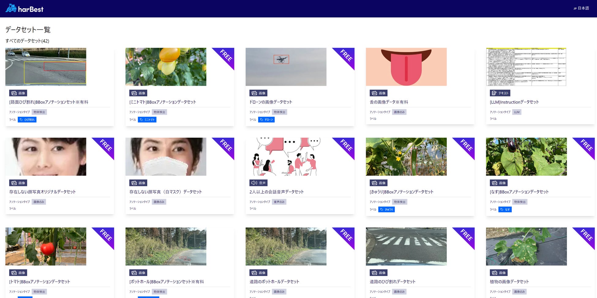 「harBest」では、お客様のデータ課題に合わせて様々な形式でのデータセット(無料・有料)をご準備しております。この度、農作物の画像データや2人以上の会話音声データなど、権利クリアなデータセット38種を期間限定で無料公開いたしますので、是非ご活用ください。
